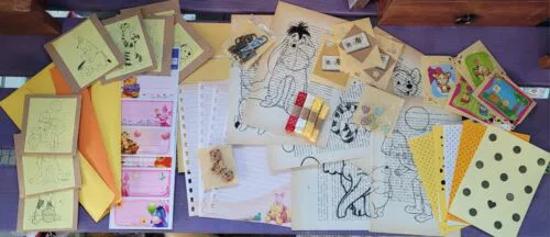FOGLIETTI/CARTONCINI STAMPA POIS BUSTE VARI FORMATI ETICHETTE ADESIVE TARGHETTE CARTA CARTONCINO HAND MADE TEMA WINNIE, API... MATASSINE NASTRO RASO, STOFFA PAGINE OLD BOOKS REALIZZATE CON STAMPA SOGGETTO WINNIE e FRIENDS PAGINE MEMO/AGENDA WINNIE POOH BOTTONI E CUORICINI DECORAZIONI IN METALLO BRONZATO ASSORTITE ... ....