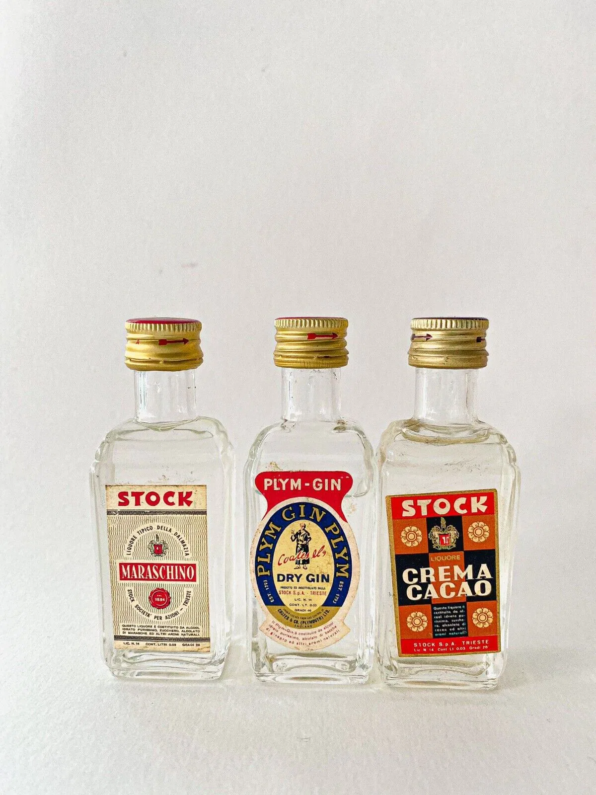Lotto 3 bottigliette stock CREMA CACAO, PLYM GIN DRY GIN e MARASCHIMO sigillate.